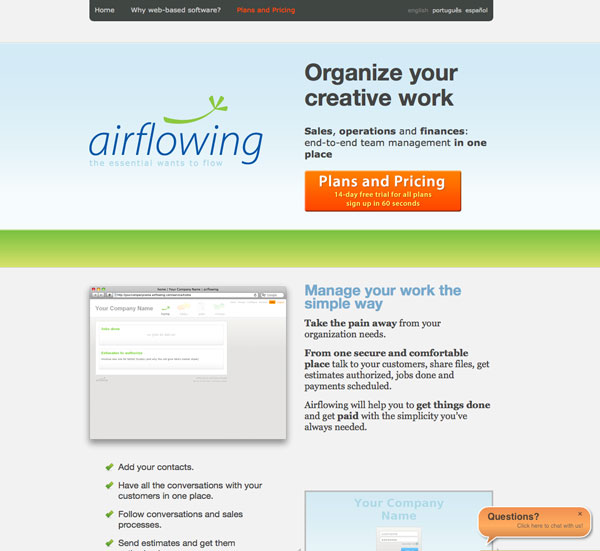 Airflowing was a web application that provided management to service companies. With an original UI design and simplicity in mind, it allowed the operations team to coordinate jobs, tasks and finances across different teammates. It was a simple yet end-to-end solution for small businesses. It ran on Pharo Smalltalk, jQuery, Aggregates, OmniBase object persistence achieving scalable and subsecond server-side rendering speeds. Shutdown in 2015.